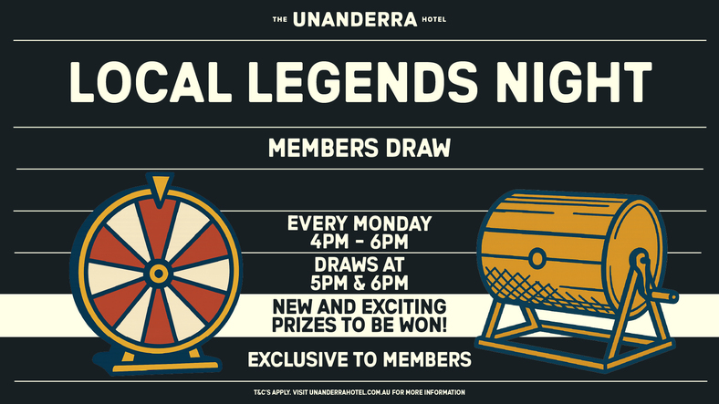 Join us on Mondays for our Local Legends Night Members Draw from 4pm - 6pm. Plenty of prizes to be won! Draws at 5pm & 6pm. T&Cs apply, see staff for more information.